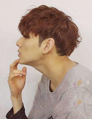 男生纹理烫卷发,同样是棕红色的染发,棕红色搭配麦色皮肤非常帅气,很显暖男气质。