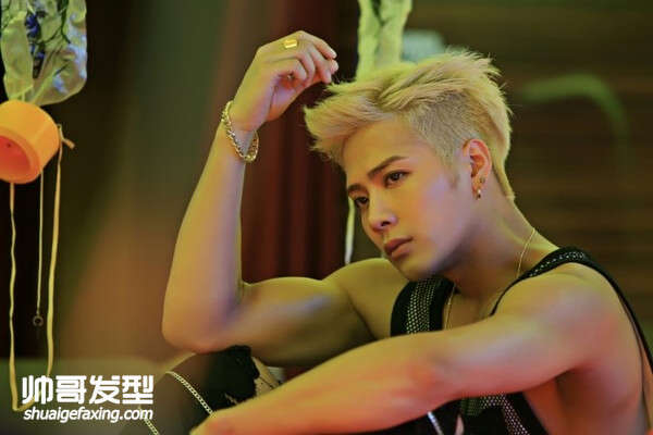 两侧削底剃光加上侧分的短发显得男生非常阳光,加上潮流的银白色染发,整个发型非常时髦。