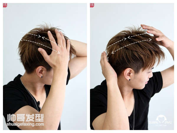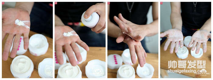 后面的头发不要忘记了 接着拿出准备好的软蜡和硬蜡 硬蜡和软蜡各取5克左右,然后撒上喷雾,在手掌均匀化开,这一步骤不能太慢,不然发蜡在手掌就已经硬了不便于后面的操作。 如图示方向开始抓头发,用力要平均这样才能均匀将发蜡均匀涂抹 然后五指散开抓顶部头发如图示,两侧部分要用手掌贴肤搓一下 大功告成! |
