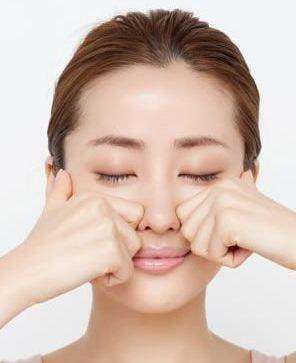 大拇指的第一关节内侧贴在鼻翼两侧,其他手指放在脸颊旁,往太阳穴方向,向上推。