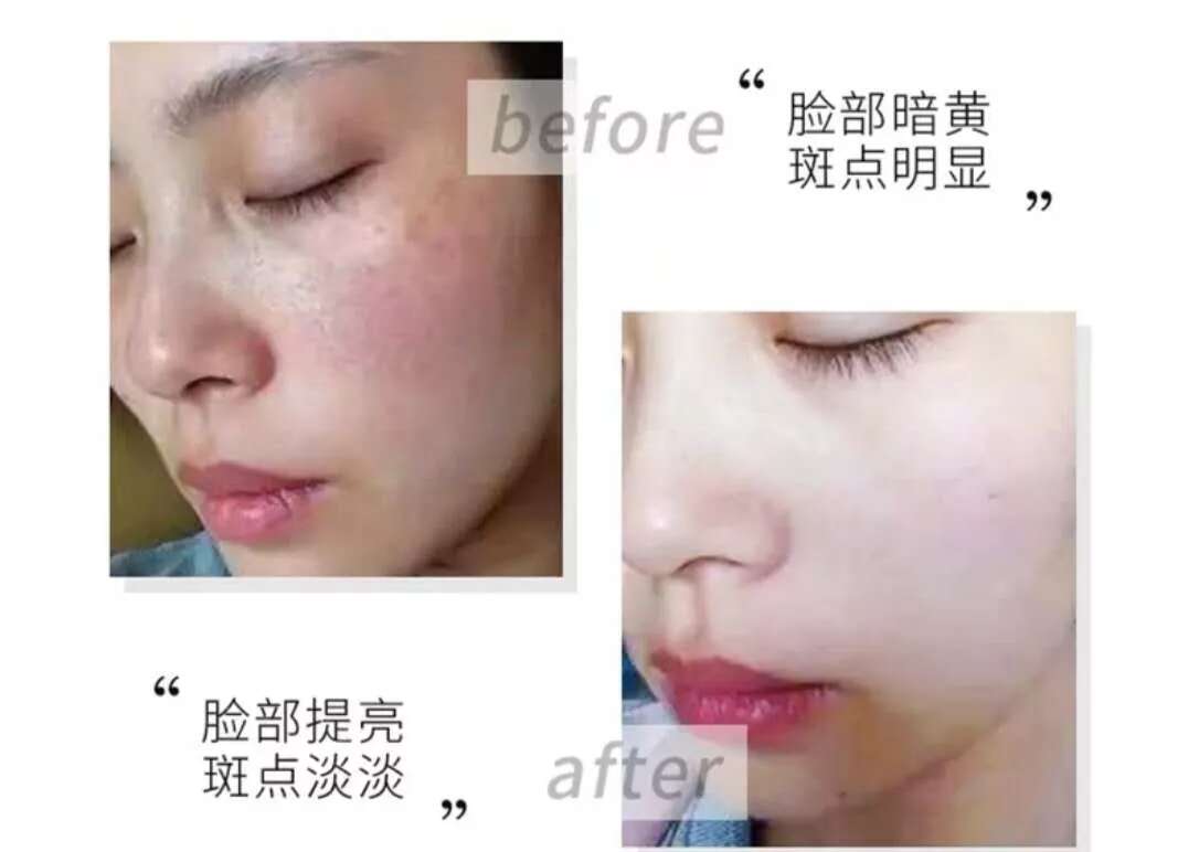 使用之前面部颜色暗沉,斑点明显;使用过后脸部皮肤比之前白皙透亮了很多,脸部在变白的同时,斑点也会淡化。