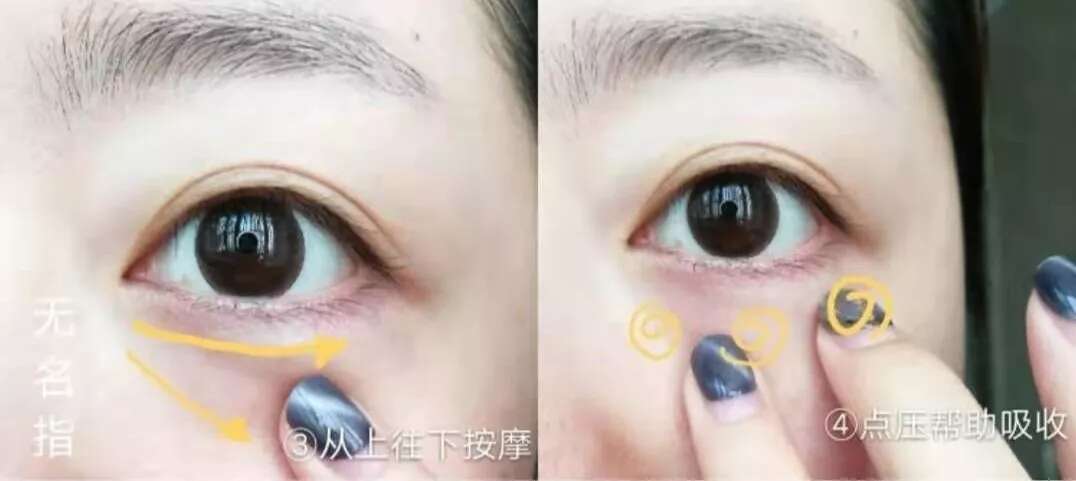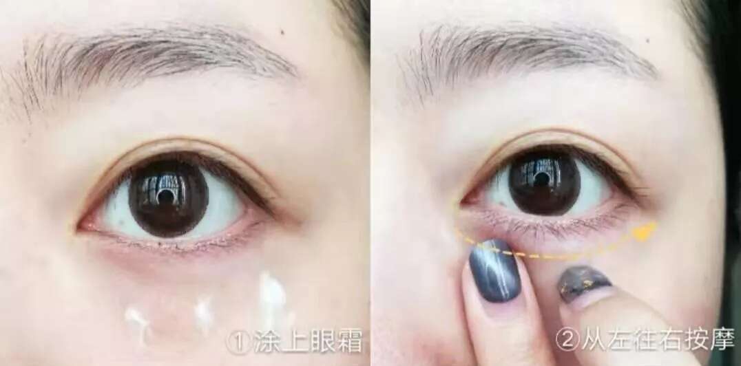 具体顺序是:从下眼尾往上眼头、再从上眼头到上眼尾,持续地、轻轻地打圈按摩直到眼霜全部吸收。