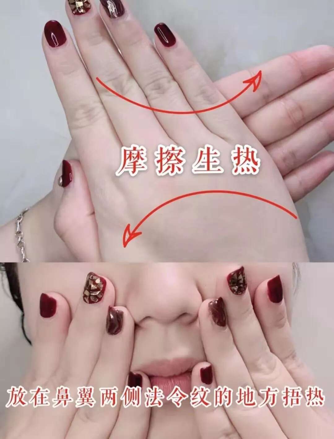 双手搓热,然后将手心放在法令纹的地方,这样可以加速血液循环;
