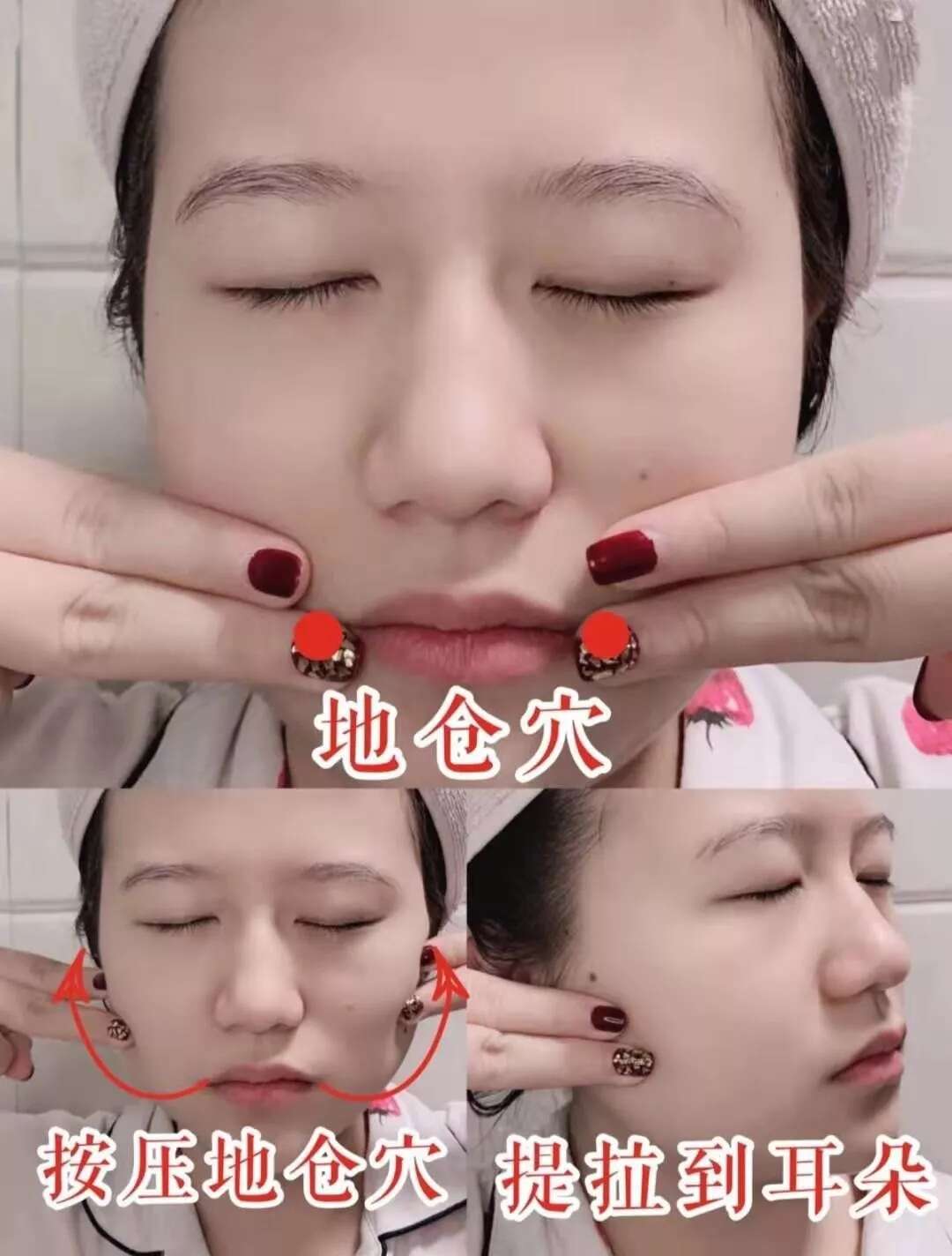 双手食指和中指按压嘴角两侧的地仓穴,一直延伸提拉到耳朵;