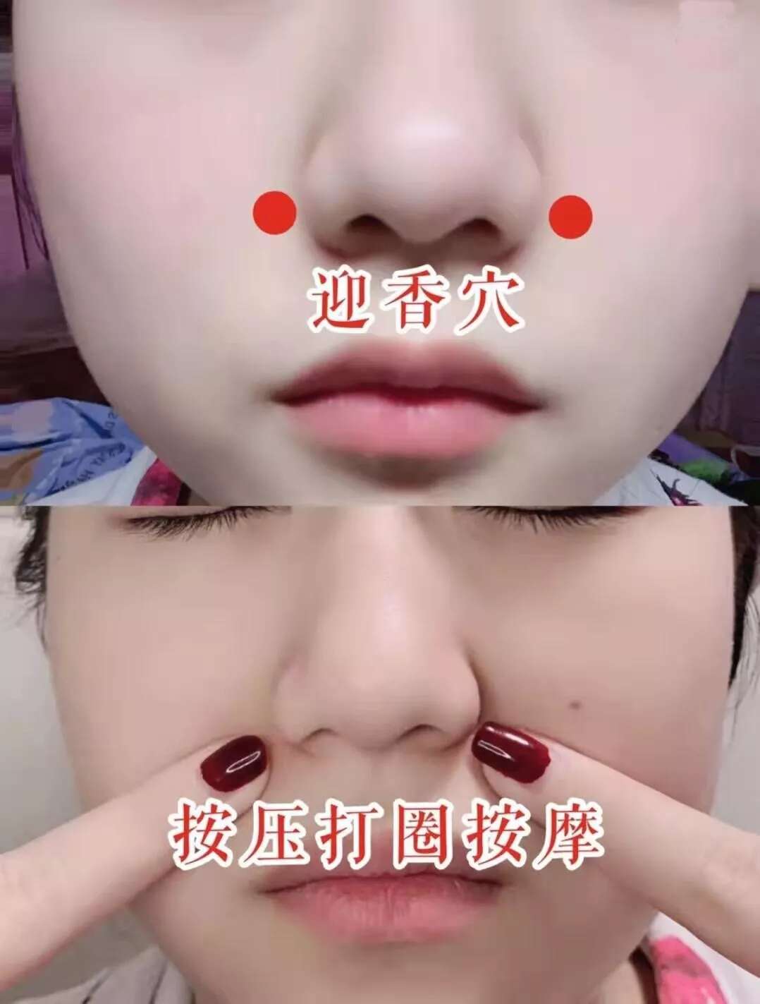 双手食指按压迎香穴,迎香穴可以淡化法令纹,还能美容养颜哦;