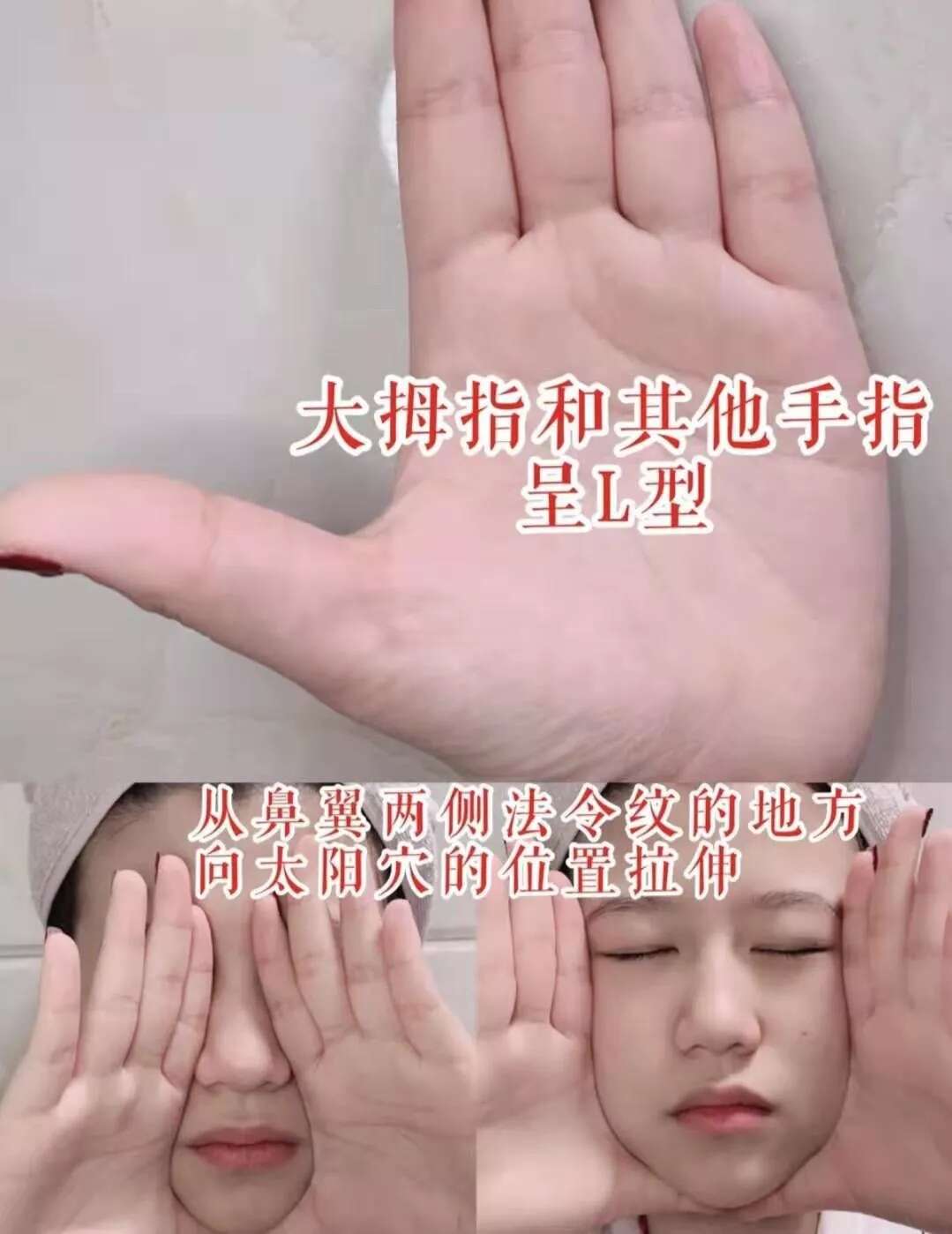 双手呈L型,从鼻翼两侧向太阳穴提拉;