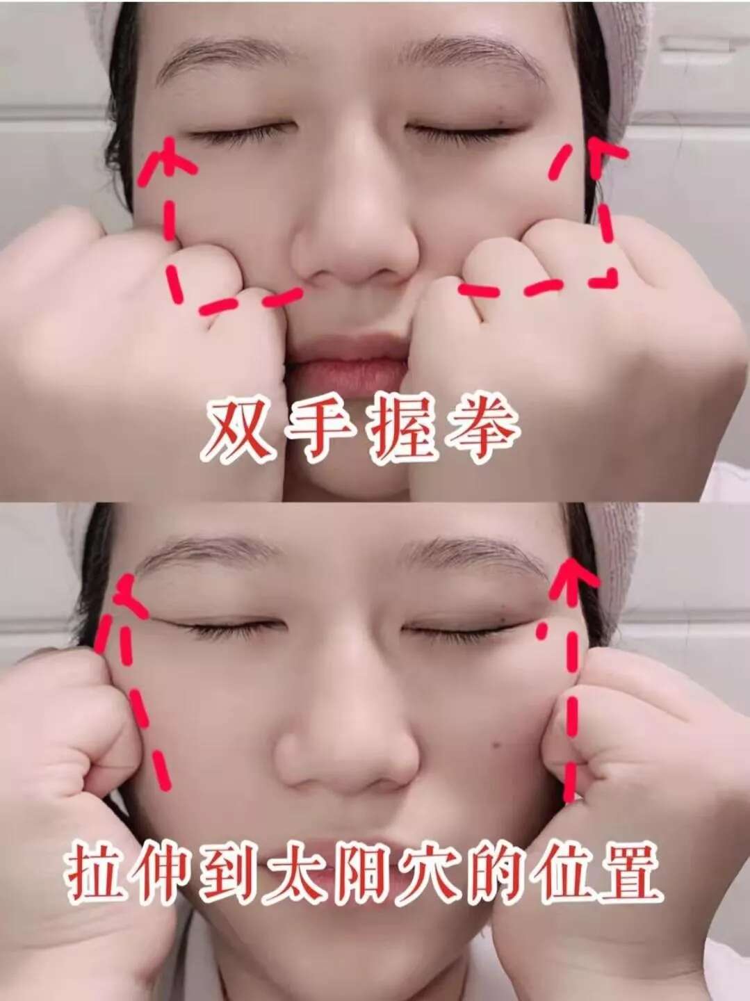 双手握拳,从鼻翼两侧的法令纹处开始,由下到上提拉肌肉。
