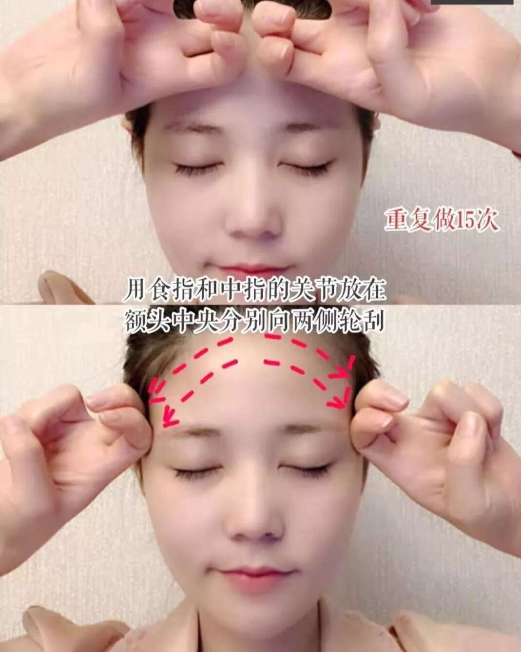 用食指和中指的关节放在额头中央,分别向两侧轮刮,紧致皮肤,改善抬头纹,重复做15次。