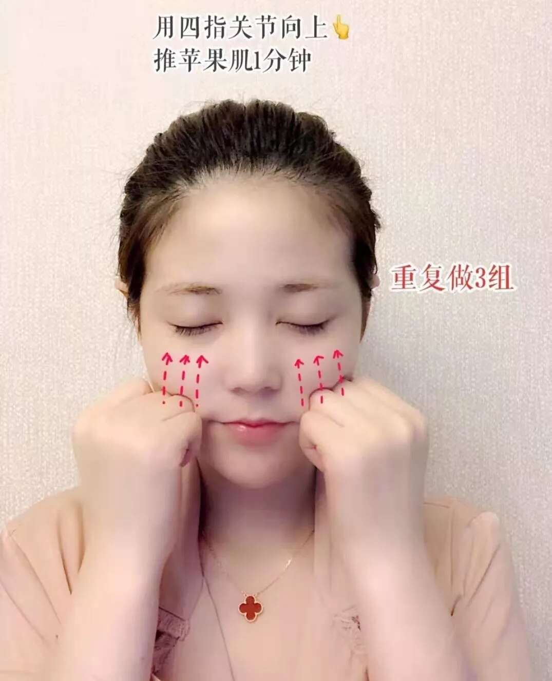 用四指关节向上,推动苹果肌1分钟,一次一组,重复做3组。