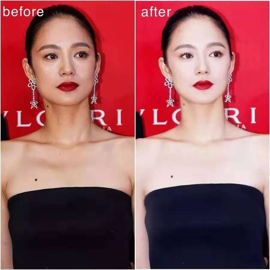周韵算是女明星里法令纹很浅的了,原图已经很惊艳了,但修图师还是修掉了她的法令纹,当然还提亮了肤色。