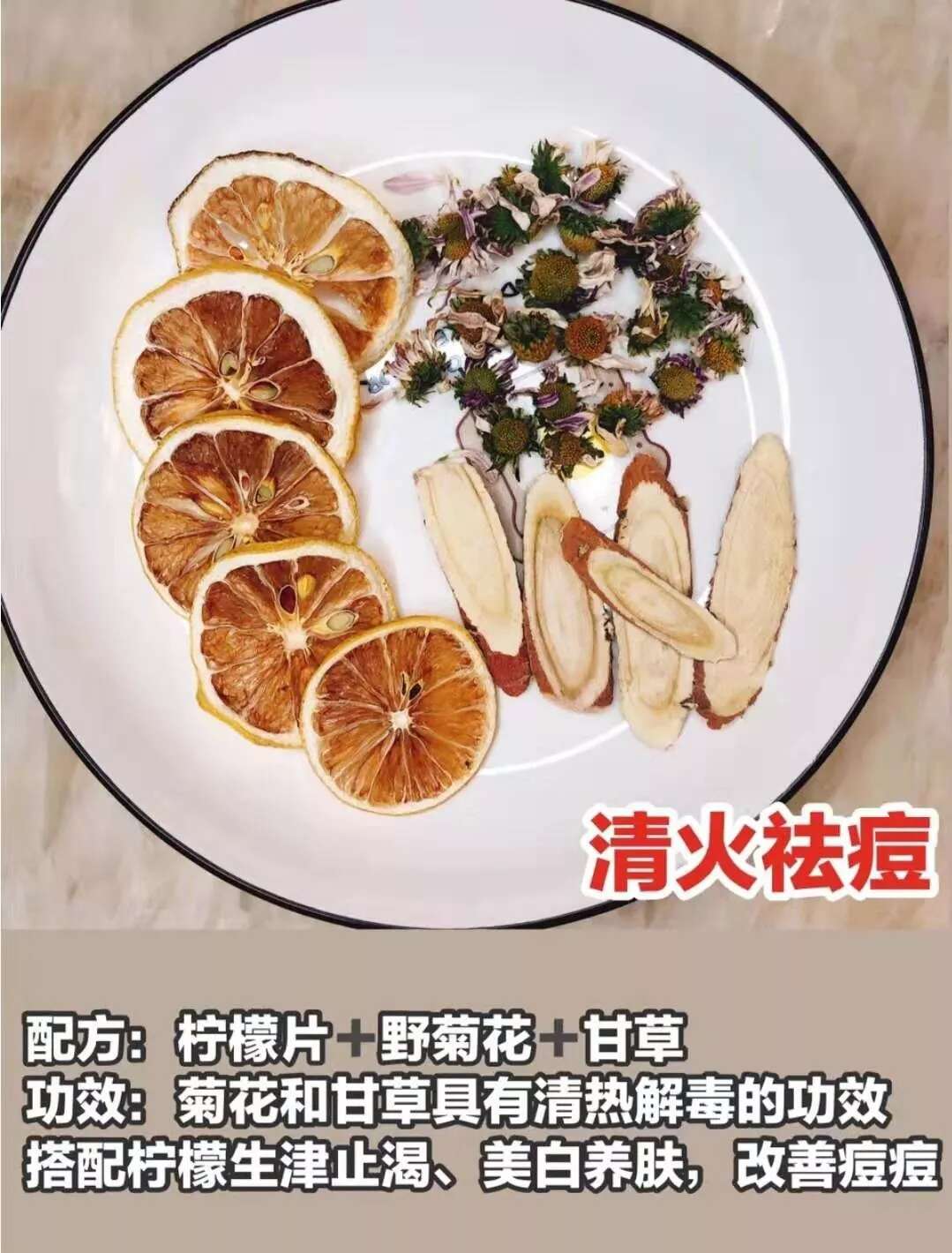 功效:长痘痘很多都是内分泌失调、内火旺盛。菊花和甘草具有清热解毒的功效,搭配柠檬片生津止渴、美白养肤。适合经常长痘痘的小伙伴喝。