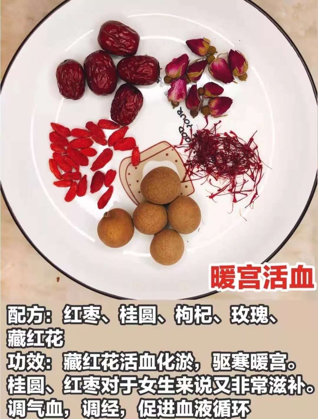 配方:红枣、桂圆、枸杞、玫瑰、藏红花。