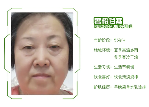 经过肌肤管家量肤分析,奢粉属于干性肌肤,整个皮肤干且屏障脆弱、面部明显松弛下垂、眼袋、法令纹、木偶纹十分明显。根据肌肤状态可以看出,皮肤的新陈代谢、吸收功能随着年龄的增长逐渐缓慢,所以在精准护肤方案中,首要通过清洁产品帮助调理肤质、清爽排污、净化毛孔垃圾;其次通过乙酰基四肽-5以及类蛇毒肽成分加速眼周肌肤微循环代谢,减轻眼袋,同时通过肌肽、棕榈酰五肽-4、三肽-1铜、乙酰基六肽-8、乙酰基八肽-3等多重胜肽成分,促进胶原蛋白合成,淡退松弛纹路,减少皮肤失弹、皱纹、松弛、下垂等衰老体征,紧实肌肤,重塑轮廓。