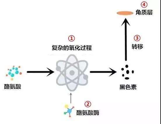 怎么用护肤品淡斑呢?我们可以再看看下面的一张图,这是黑色素的形成过程。
