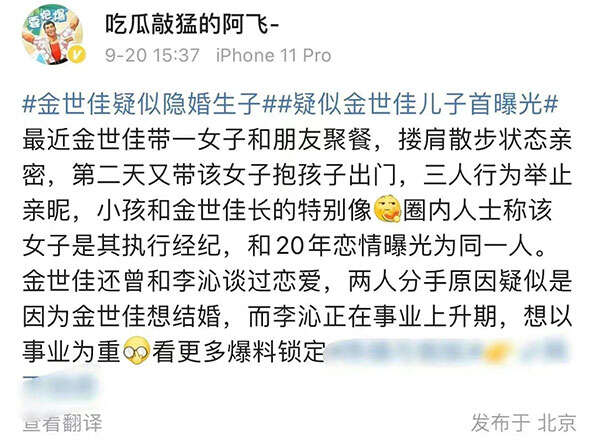 当然对于金世佳与李沁的恋情,到目前为止两个当事人并未正面回应过,也都是网络上人们扒出来的。2015年5月,金世佳与李沁曾被拍到一起去日本,在9月份时又被拍到一起牵手回到社区。而虽然两人被拍到过很多次,但是两个当事人始终没有做出过任何回应。不过就在两人恋情被曝光后没多久,却传来了两人分手的消息。曾经有一段时间,李沁连发几条悲感的微博。比如:“有人来你的生活,给你一个教训,然后走了”“秋……一个悲伤的季节……”等诸如此类,所以有人猜测是两个分手了。而就在当年的10月份,八卦媒体曝光了金世佳和盖悦熙一起回家的场景。