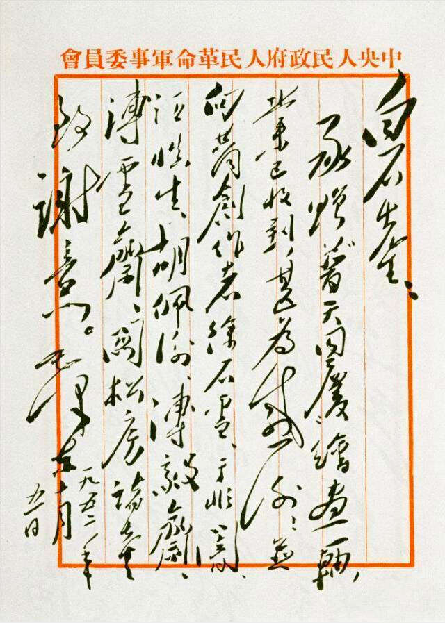 毛主席非常感动,亲笔为画家们回信致谢。信文如下——白石先生:承赠‘普天同庆’绘画一轴,业已收到,甚为感谢!并向共同创作者徐石雪、于非闇、汪慎生、胡佩衡、溥毅斋、溥雪斋、关松房诸先生致谢意。毛泽东一九五二年十月五日。