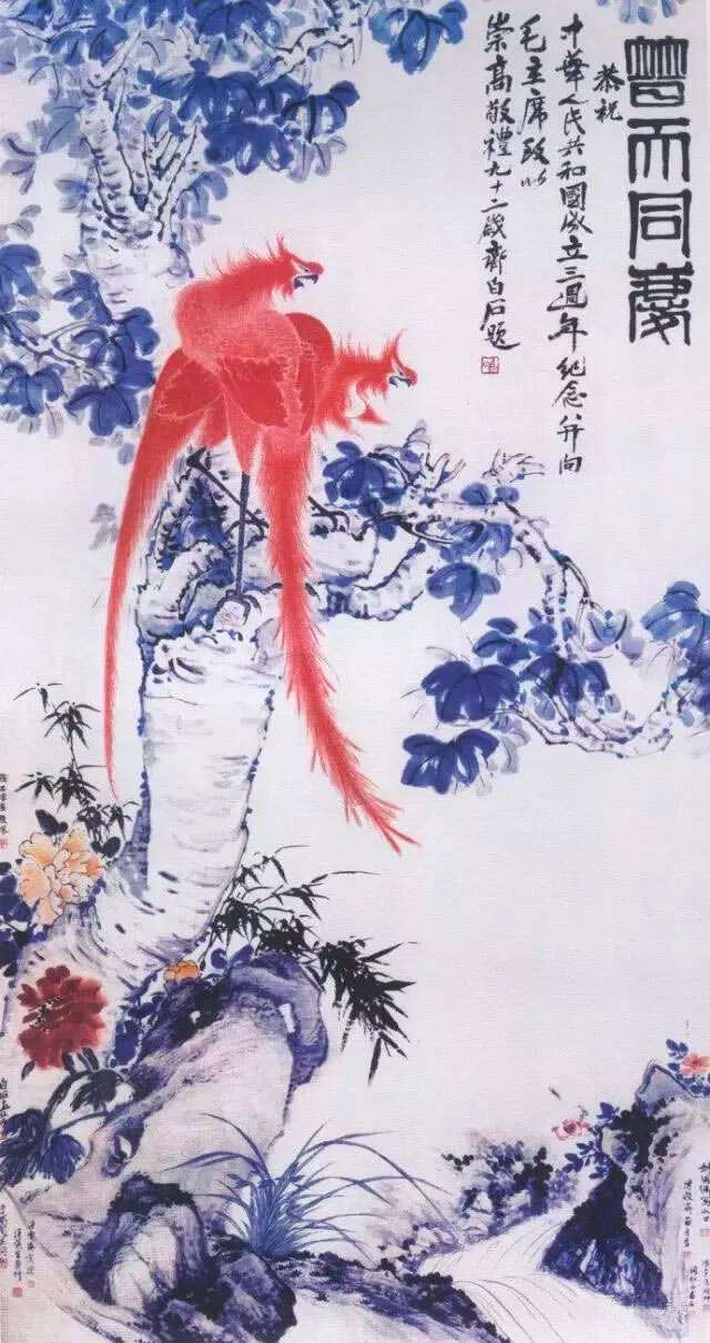 1952年,齐白石领衔湖社和松风画社的画家为中央人民政府创作了巨幅国画《普天同庆》,为中华人民共和国成立3周年献上了一份厚礼。题识:普天同庆。恭祝中华人民共和国成立三周年,并向毛主席致以崇高敬礼。九十二岁齐白石题。款署:徐石雪画双凤。白石画牡丹。于非闇写桐。汪慎生画竹。胡佩衡写水口。溥毅斋画月季。溥雪斋写兰。关松房画石。潘素写坡草。