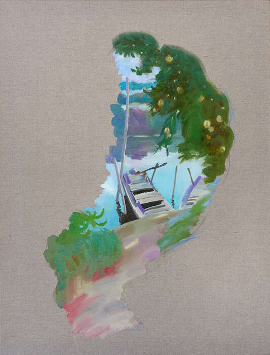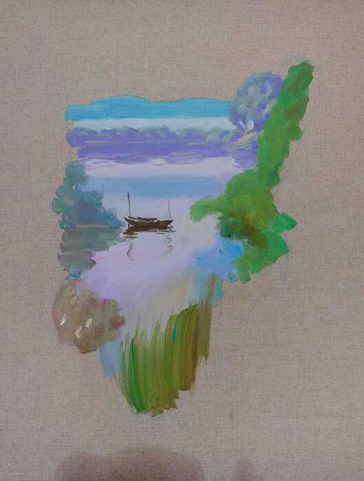 过了30多年,赵半狄再次去往白洋淀,画下三张风景,忠实于自然的手法早已不再。优美的田园风光,变成了梦幻中的场景。风景也沾染了时间的情绪,水中的小船像是梦境中铭刻的光影、少年的旧梦。不完整的画面,像是一面破碎的镜子,或是水中摇曳的倒影,哀美的记忆,有了三个浪漫的名字《16岁的风景》《伊甸园的小径》《黄昏的缠绵》。