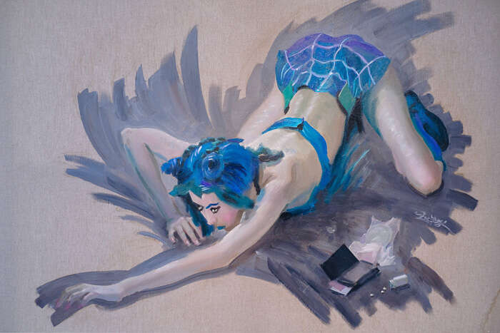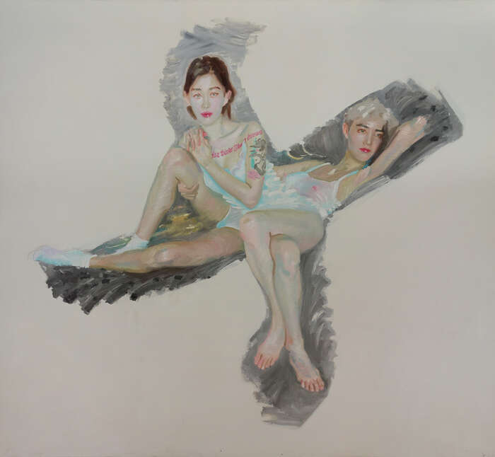 也是在30多年后,赵半狄再次拿起画笔,描绘身边的年轻人。一张名为《17岁女生璐楠的肖像》,描绘了一位穿着动漫人物服饰的女孩,渴望在二次元的世界中,扮演想象中的故事。另一张《Miyou和曾经的朋友》,讲述了两位时尚女孩光鲜、青春而又靓丽的后现代生活。画作中交叉的形状充满跃动,时间也仿佛在明快、冷丽的色彩中不断加快。和30年前的那张画作相比,时代和人物的样貌早已变了模样,年轻的价值模糊了单一的传统:现代、摩登、冷艳、新鲜,与古典、永恒、温暖、成熟在画作间交汇。