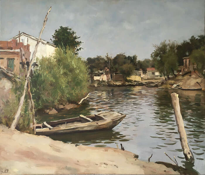 1990年代初,赵半狄来到白洋淀,那是一块因“白洋淀诗群”而扬名的北京远郊,和莫斯科的郊外不同,那里的风景和它的名字一样朴实、传统,甚至略带古典的乡愁,充满自然主义的风光,悠闲自得的小景。赵半狄画下一张名为《白洋淀·端村》的小幅风景,画中的木船停泊在一处村床的湖泊旁,绿幽幽的景色,纯洁的天空,像是19世纪法国画家笔下的巴黎郊外的巴比松。