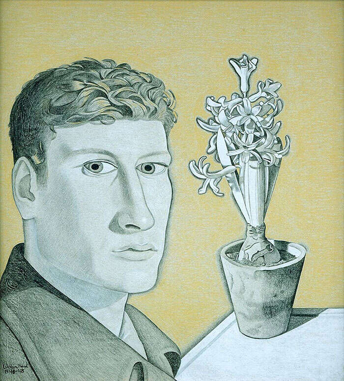 《自画像与风信子》(Self portrait with Hyacinth Pot),卢西安·弗洛伊德,1947年©Bridgeman Images
