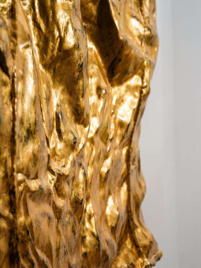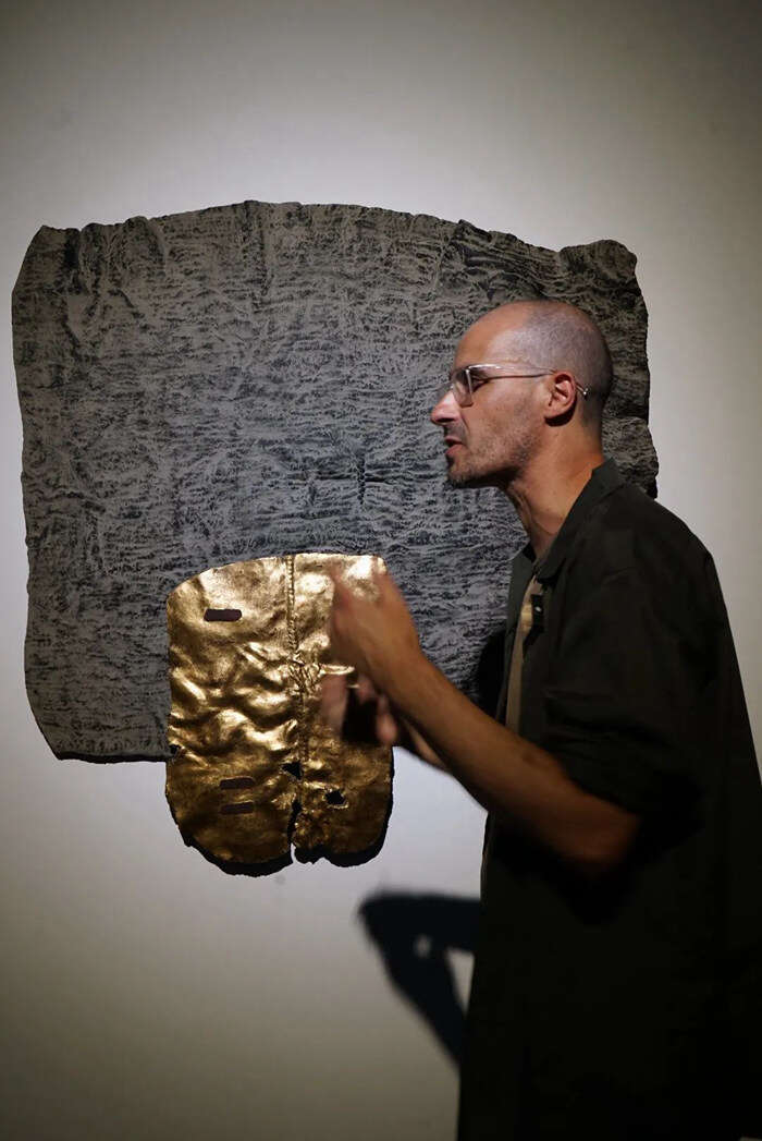 他对旧米袋也是偏爱的,他认为米袋曾经作为实用之物,如此不起眼又“吃苦耐劳”,基本上是被用完即弃;但它曾可能去过很多地方,承载了很多东西……于是就有了以米袋为载体的代表作作品,米袋褶皱的肌理被覆盖在平滑如镜的金箔之下,而金箔也因此有了褶皱的肌理,两种截然不同的材质似乎浑然一体,远望之如洒满阳光的山峦,重岩叠嶂;而细节的材质衔接部分则以大漆自身的色泽变化(乳白、棕褐、漆黑三色)展现生命孕育的初始形态,诉说着自然的本源。