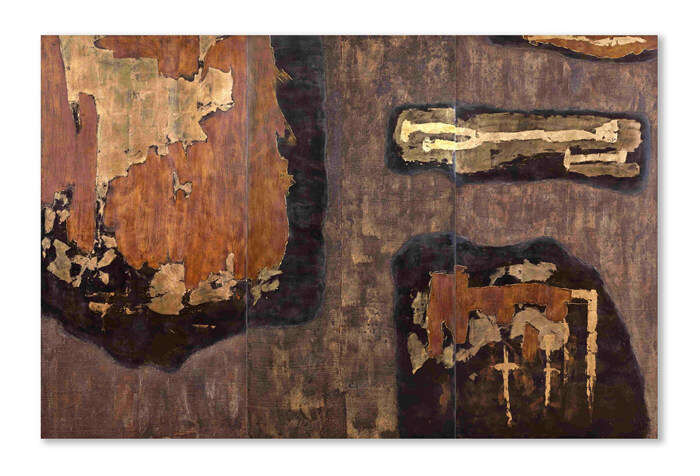 文森·漆,无题,2013,三联幅,大漆,亚麻纤维织物,氧化铜箔、金箔绘于木板,180 x 270 cm (180 x 90 cm每幅)(图片由杜梦堂画廊提供)