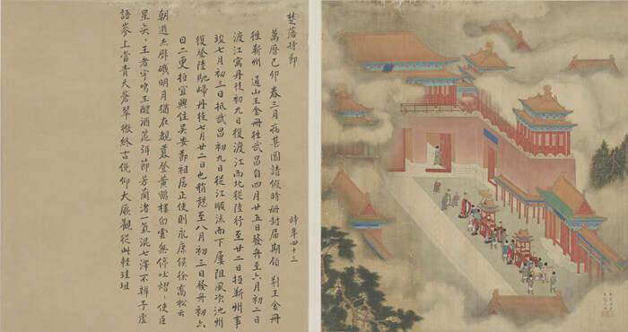 明万历七年(1579 年),徐显卿(1537–1602 年)作为副史前往武昌与蕲州等地,册封藩王及妃。此图可见徐显卿等人随两架龙亭自午门而出的情景。龙亭是明清两代盛放重要神位和官方文书的礼仪载具。