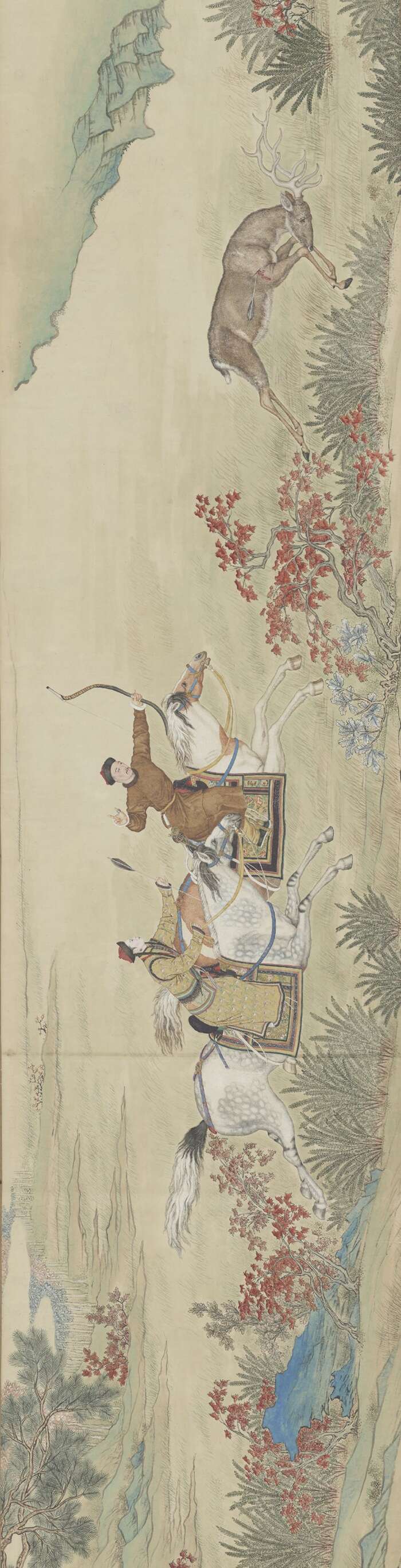 此图描绘乾隆帝与一位皇室女子在木兰围场中骑射的场景。位于现今河北省的木兰围场,以林木茂密、动物种类繁多而闻名。秋风红叶,青草地上,这名皇室女子在策马之际仍能脚踏马镫,向乾隆帝奉上羽箭,助其射鹿,英姿飒爽,显示出清宫女子多样的风采。