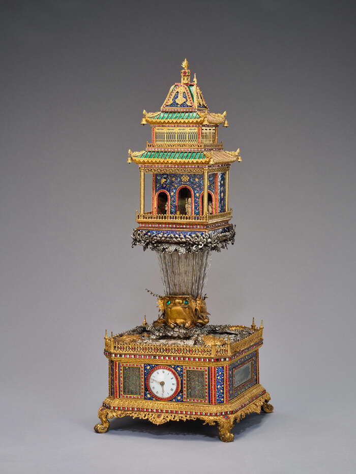 楼台式水法钟 清宫内务府造办处 清乾隆 (1736–1795 年)铜镀金、嵌珐琅、玻璃 故宫博物院