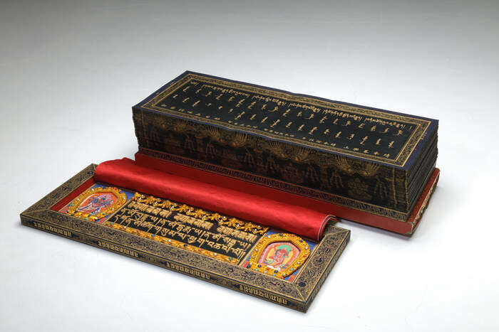 藏文大藏经中的经部及律部合称《甘珠尔》。此《甘珠尔》经是乾隆皇帝送给母亲崇庆皇太后(1693–1777 年)的八十大寿贺礼,为一百零八函的其中一函。礼物灵感来自康熙帝,他曾支持祖母孝庄文皇后(1613–1688 年)御制藏文《甘珠尔》泥金写本。