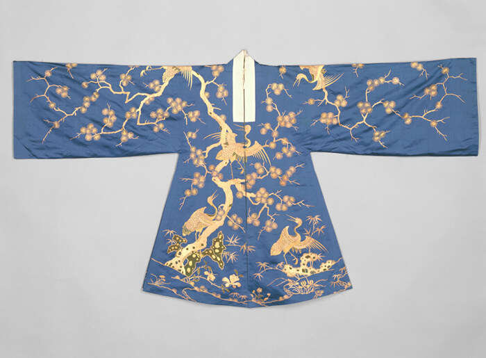 这件戏服为老年妇女角色所穿着。松树与仙鹤纹饰寓意长寿,或与剧中祝寿场景相关。衣上的图案採用奢华的金线和孔雀羽毛绣成。此件戏服见证了乾隆时期宫廷演戏的繁盛景象,当时为皇室服务的伶人过千,戏服道具极尽精美。