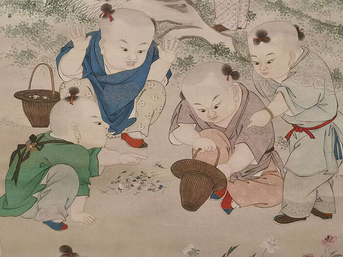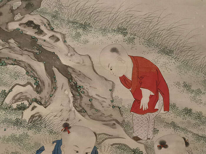 同为清代画家,金廷标的《婴戏图轴》表现了一出五月孩童斗草、玩耍的场景。画面中的几个小童此刻正沉浸在自己的世界里: