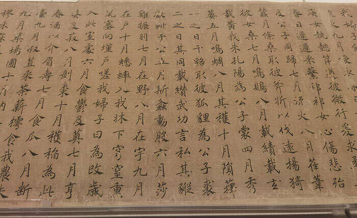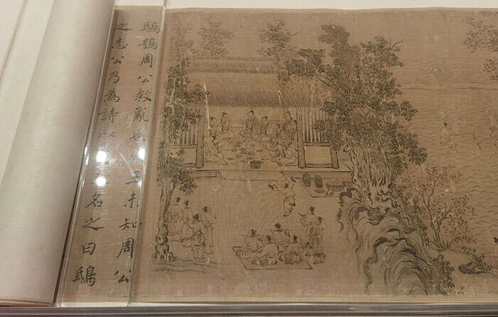 南宋著名文人画家马和之所作《豳风图卷》也许就是凭借这寥寥几根线条的功力俘获了乾隆的心。《豳风图卷》由马和之根据《诗经·国风》中《豳风》一篇所作,全卷共分七段,现场可见的是该卷的“七月”段。全图设色简淡,情景布局疏阔,格调古雅。