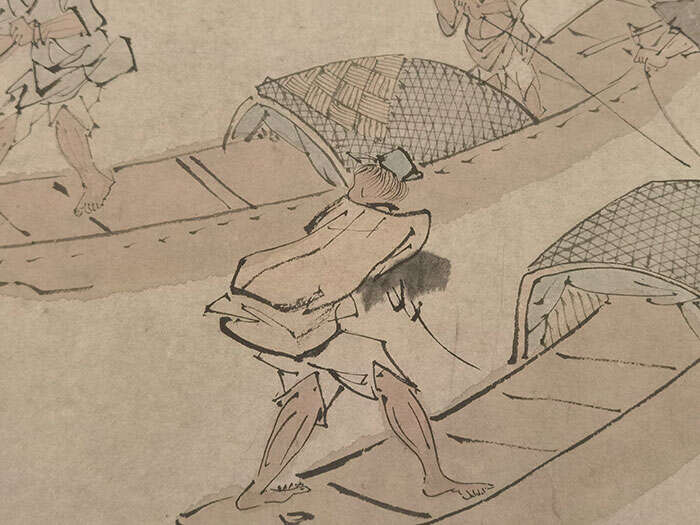 在明代周臣《渔乐图卷》里,笔墨线条又被演绎出另一番意趣。人物以勾写塑其形廓,薄色淡染,衣纹施镢头描。周臣极善把握富于情节与人物动势的生活场面,这幅画面描绘了江南水乡渔人作业生活的场景。画幅右上角的渔人不知道是不是发现了什么大鱼,正迅速张弓对准水中的“猎物”,站在船头的渔夫也用手里的网兜积极配合着,离我们最近的渔夫背对我们扭头看向水里,两只脚一前一后,身体前倾不忘保持平衡,周臣十分敏锐地捕捉和刻画下这一生动瞬间,也表现出渔人们于生计中寻找乐趣的生活态度。