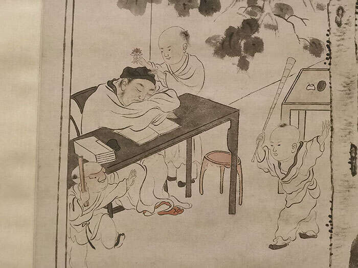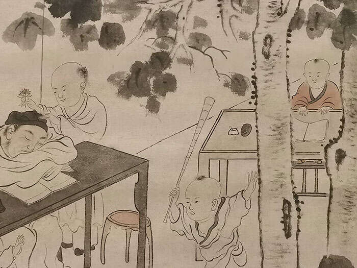 华嵒《桐屋闹学图轴》,画家以白描刻画人物,先生伏案沉睡,小童趁机大闹学堂,孩童形象的塑造虽有程式化的一面,但画家对人物表情、性格和内心世界的表露却很鲜明。