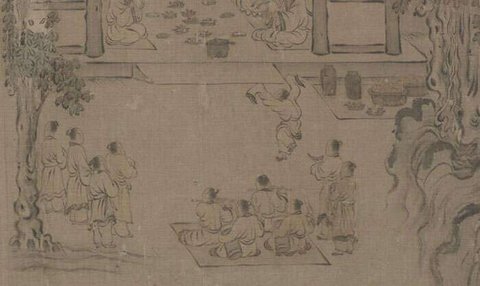 马和之的人物画上承李唐又比李唐更进一步,他将笔墨技法由塑造形象转变为线条本身的审美和意趣上。比如画面中心几位正在干活的家丁,几笔流畅利落的线条,便使人物的身姿、情态尽显。