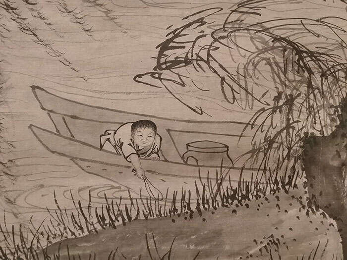 张灵的《渔乐图轴》,山石处展示了画家高超的斧劈皴画法,人物脸部的刻画虽不及前人那么精细,但张灵也有他的好处:笔法草草,如一阵乱麻,线条虽朴拙,但人物眉目清晰传神,身姿情态生动,我们仿佛如置身现场,水面上的波纹在一圈圈散开,母亲正要把菜夹到孩子碗里,那个趴在船头的小童差点就捞起了一条小蝌蚪。