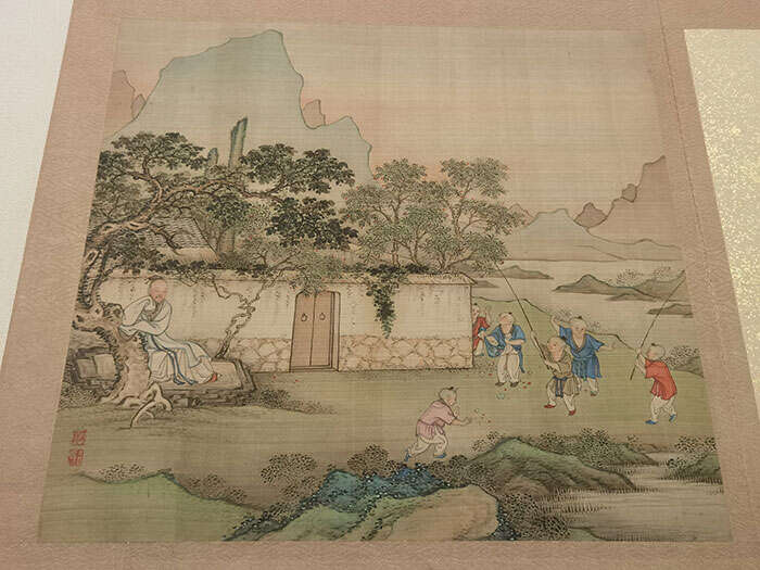 此幅为冷枚《农家故事图册》中的一幅,画中婴孩招蜂引蝶的天真浪漫,与倚树老者的泰然自若相映成趣,一动一静,自成妙理。冷枚对山峦的处理颇具特色,不同于传统中国画中山的画法,他以线条勾勒出山的轮廓,边缘清晰,山体薄施彩,平涂,富有现代趣味。