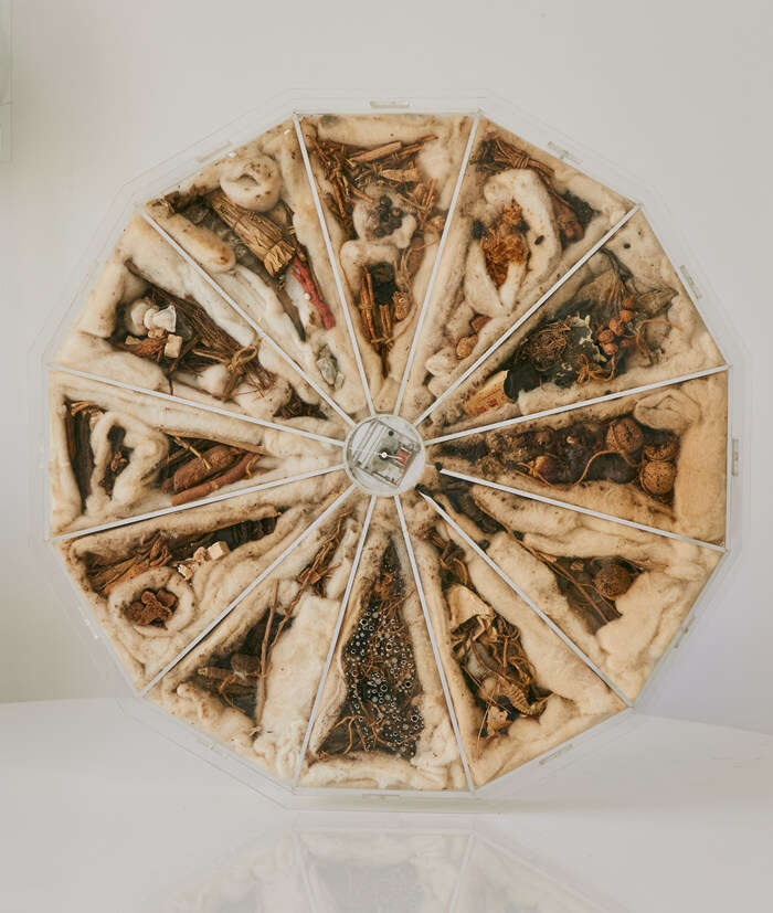 蔡国强-《生命历No.1》-81×78.5×9cm-中草药、时钟、棉花和有机玻璃-1994