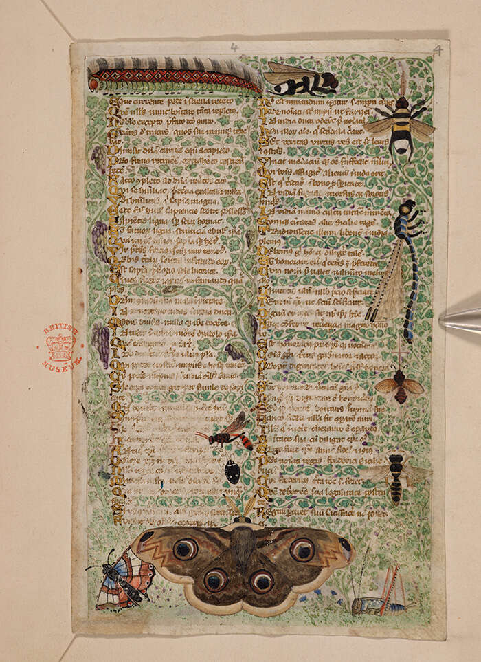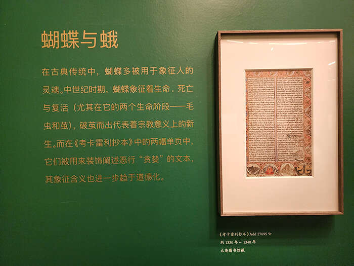 蝴蝶在中世纪的意大利象征着生命、死亡与复活,破茧而出代表着宗教意义上的新生。在《考卡雷利抄本》的这幅单页中,它们被用来装饰阐述恶行“贪婪”的文本,其象征含义也进一步趋于道德化。