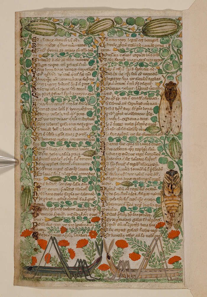 跨越欧亚,遥隔古今,大自然中的生命总能吸引艺术家不断用手中的画笔为其赋彩、造型。齐白石以“一花、一草、一虫”描绘宏观世界,并在其中融入对生命的感悟,饱含了中国艺术的寄情之味。他画“草间偷活”,表达身处乱世的人生慨叹;画“蝴蝶飞蛾”,寄托自己内心的家国之思。他笔下的蟋蟀、知了、螳螂……充满着生机与活力,或跳跃、或爬行、或飞翔、或欢鸣,每一个都是鲜活的生命,每一个又都寄寓了白石老人的感悟与深情。而在14世纪的意大利,由热那亚的考卡雷利家族赞助完成了一部以美德和恶行概念为主题的插图抄本,在页面边缘和字里行间挤满了各类昆虫,显示出意大利画师为自然写照的不同手法。象征纯洁的蜜蜂,象征着灾异与魔鬼的蝗虫,象征生命、死亡与复活的毛虫和蝴蝶……让抄本的纸面转变成一个充满道德寓意的动物乐园。