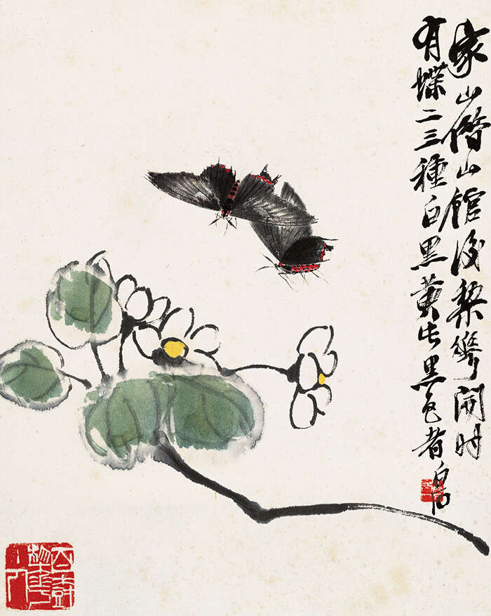 齐白石对蝴蝶、飞蛾的理解与表现,既源于道家传统思想,如《庄周梦蝶图》题画诗云:“世人欲想化仙去,熟读庄周所著书”,又寄托了自己的家国之思。如《题双蝶画幅》和《画扇报樊山先生题跋虫册》,也有时光飞逝、往日如梦的感叹。此外,他还多引用中国传统文学典故,如“飞蛾扑火”,表达出他对这类日常习见的小飞虫的怜爱。