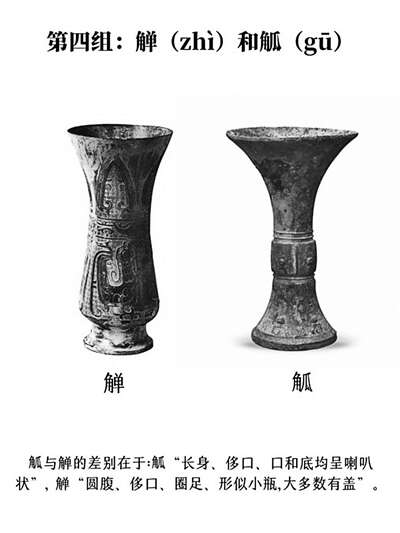 【辨别方法】 觯:圆腹、侈口、圈足,形似小瓶,大多数有盖。 觚:长身、侈口,口和底均呈喇叭状。