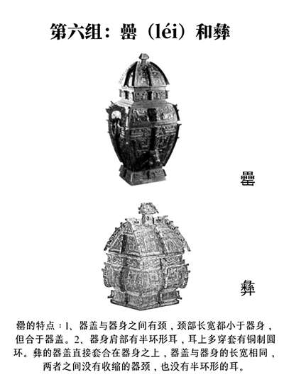 【辨别方法】 罍的特点:1.器盖与器身之间有颈,颈部长宽都小于器身,但合于器盖;2.器身肩部有半环形耳,耳上多穿套铜制圆环。 彝的特点:彝器盖直接套合在器身之上,器盖与器身的长宽相同,两者之间没有收缩的器颈,也没有半环形的耳。