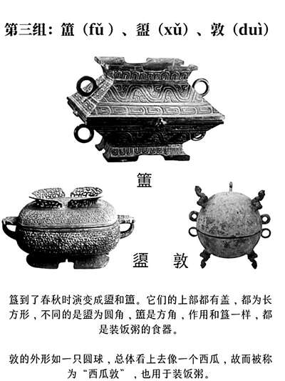 【辨别方法】 簋到了春秋时演变成盨和簠。它们的上部都有盖,都为长方形,不同的是盨为圆角,簠是方角,作用和簋一样,都是装饭粥的食器。 敦的外形如一只圆球,总体看上去像一个西瓜,故而被称为“西瓜敦”,也用于装饭粥。