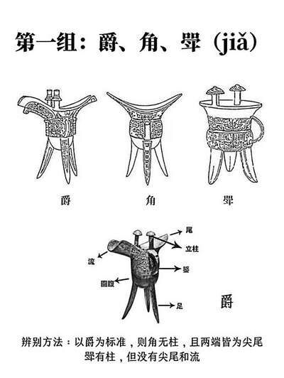 【辨别方法】 角无柱,且两端皆为尖尾。 斝有柱,但没有尖尾和流。