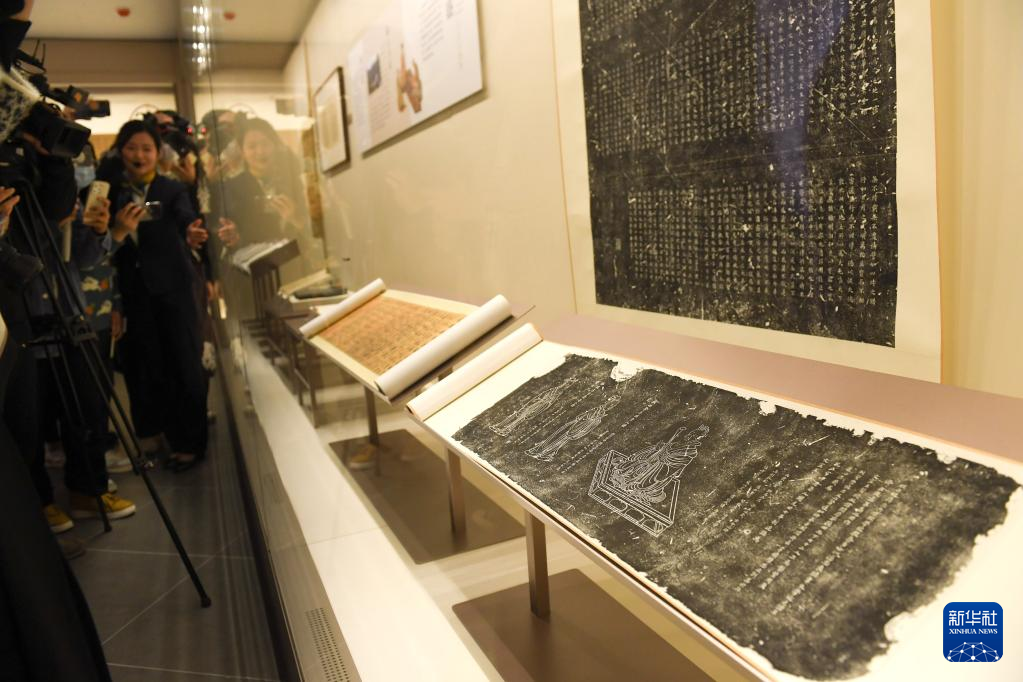 11月14日,讲解员在介绍南宋德寿宫遗址博物馆内展陈的南宋刻《孔子及七十二弟子像赞》石刻拓片。