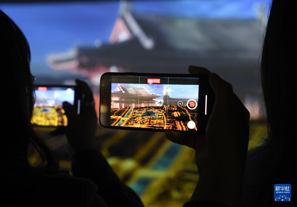 11月14日,两名女子在拍摄南宋德寿宫遗址博物馆利用空间投影技术在宫苑建筑遗迹上呈现的皇城景观。