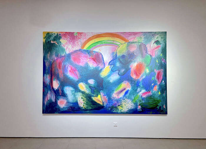 艺术家于航、贺勋和于艾君的加入,则更丰富了展览对于绘画表达形式的探讨。于航的创作富有酒神精神,饱含纯真的直觉和生命冲动。在其色彩强烈、奔放挥洒的画布上,骷髅在彩虹下对话,云朵化作缤纷的气球。我们很容易被画中的自由意志所感染;“画中的一切都是具体的……我们可以在脑海中幻想每一处暗藏的戏剧。”